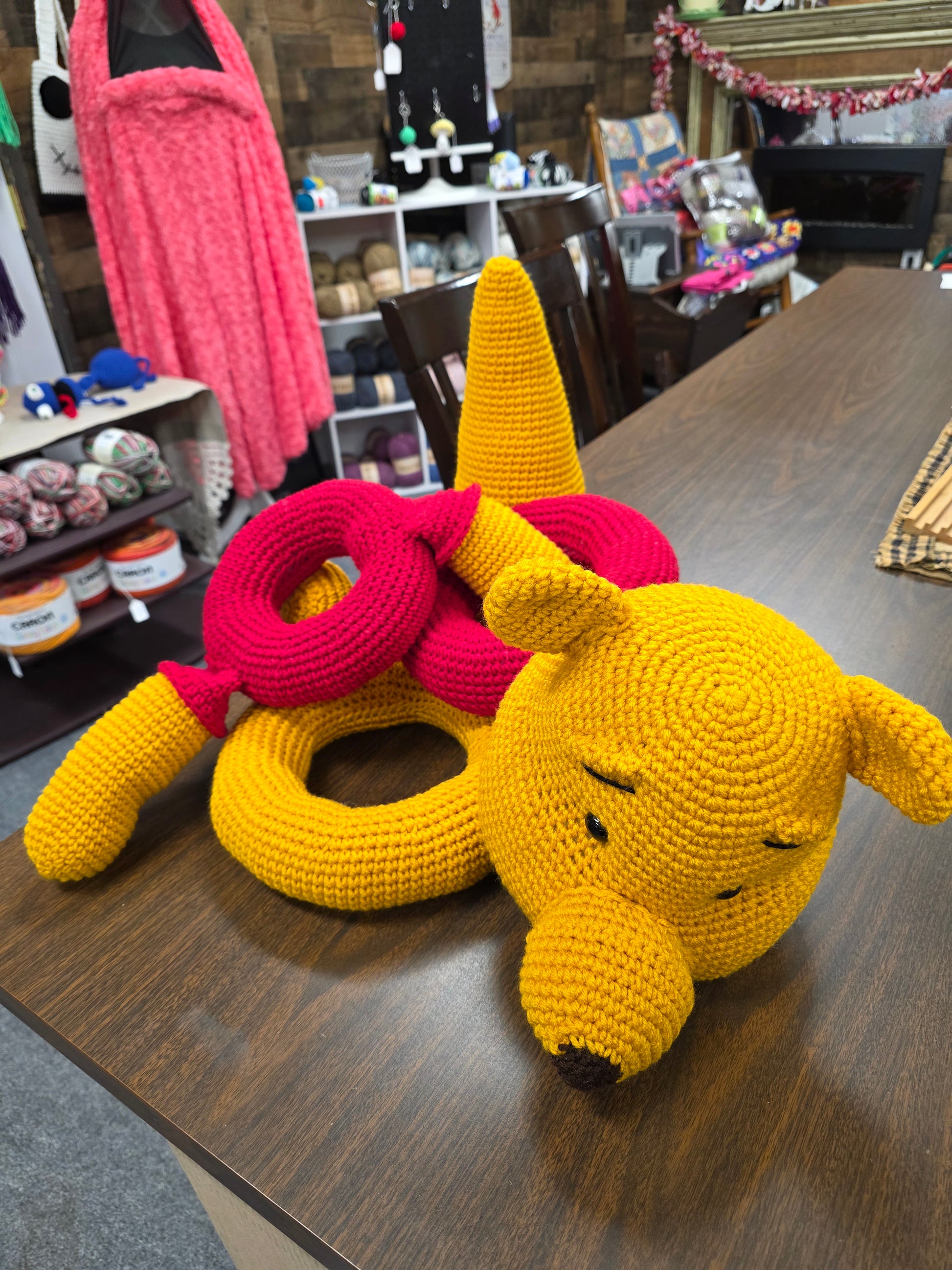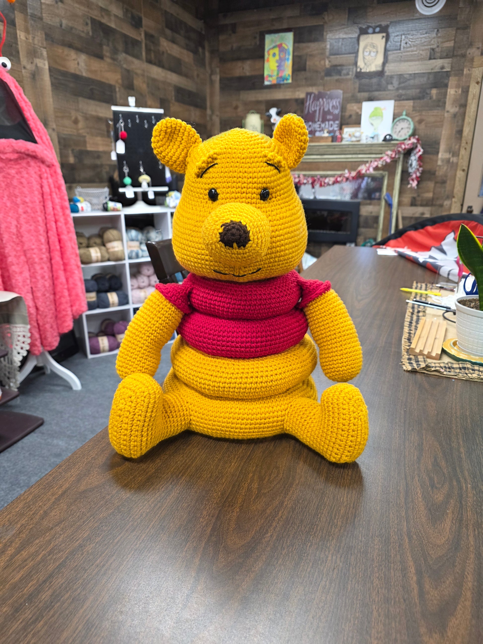 All plush, nothing hard except his eyes. Made with worsted weight yarn.